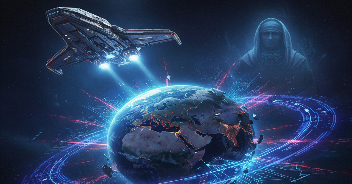A mystical, slightly ominous illustration depicting a fragmented globe with subtle lines radiating from an Eastern region, surrounded by elements representing advanced AI circuits, a large spacecraft approaching Earth, and a distant, ethereal figure symbolic of a prophet or mystic.